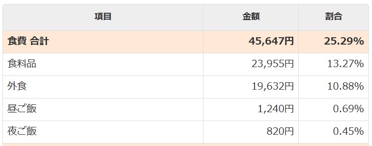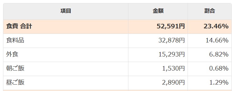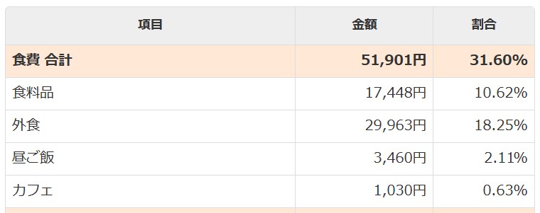 食料品+外食の合計は150,983円となり、1ヶ月あたりの平均は50,328円となりました。